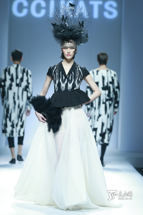 “艾德莱斯出天山”主题时装发布亮相中国国际时装周现场,新疆设计师迪拉娜 · 扎克尔作品。(图由本人提供)