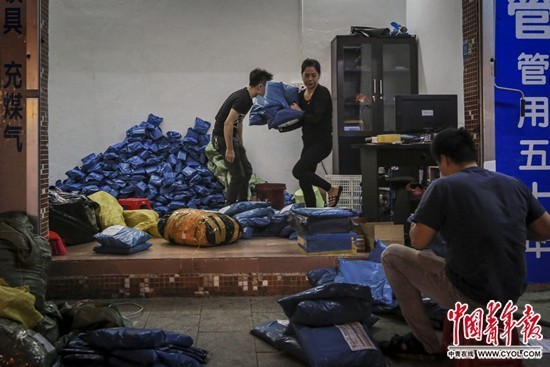 11月5日晚11点,广东省广州市里仁洞村一个快递点里,工作人员杨雪丽在收发快递。里仁洞村是著名的“淘宝村”。记者 赵迪/摄
