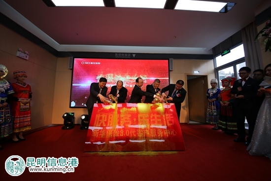 各领导代表为新华保险云南分公司“快服务、乐生活”3.0代客户服务中心柜面旗舰店揭牌。