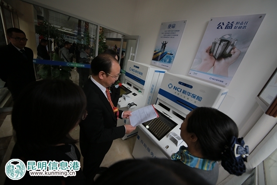 揭幕仪式嘉宾在新华保险云南分公司3.0代客户服务中心自助业务办理区体验。