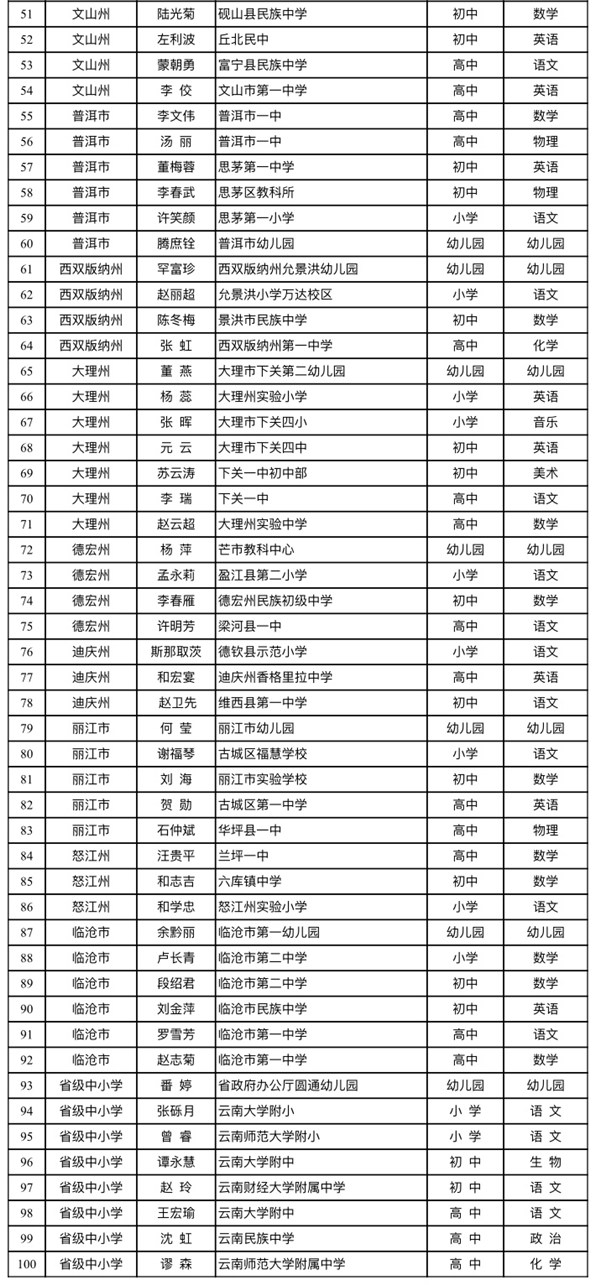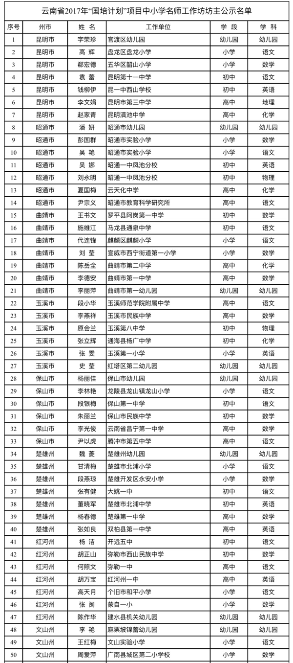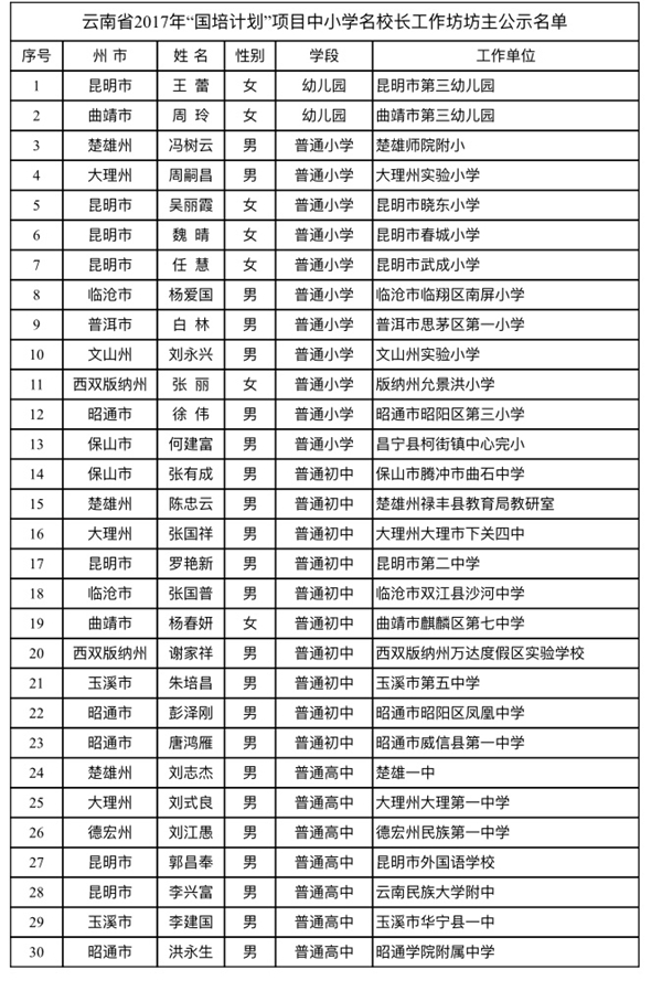 云南省2017年“国培计划”项目中小学名师名校长工作坊坊主公示名单