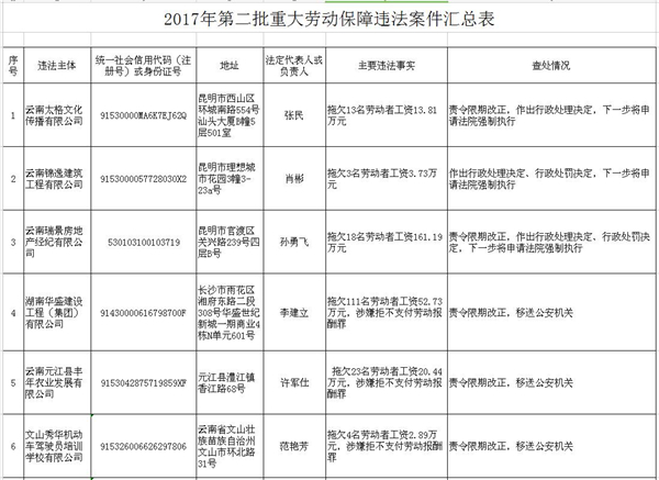 第二批重大劳动保障违法案件,共涉及云南瑞景房地产经纪有限公司、普洱市思茅区佤鑫大酒店、保山宝盈生物质能源有限公司等18家公司,涉及姜发均、卢林军、吴国团、张正义等4名个人。