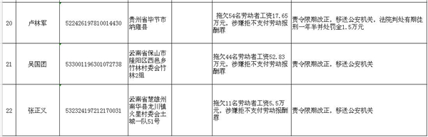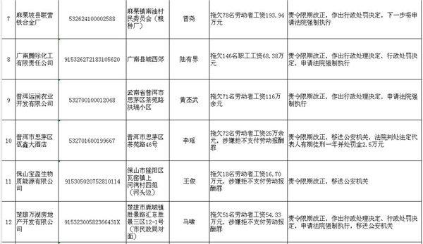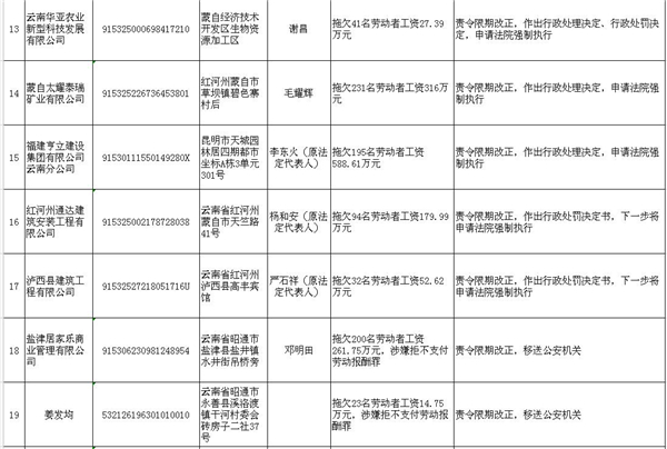 福建亨立建设集团有限公司云南分公司,拖欠195名劳动者工资588.61万元;蒙自太耀泰瑞矿业有限公司,拖欠231名劳动者工资316万元。以上两家公司,相关部门均已责令其限期改正,作出行政处理决定,并申请法院强制执行。