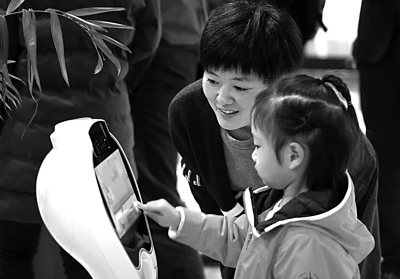 二〇一七中国光谷国际人工智能产业峰会,观众在展区与人工智能设备互动。光明图片/视觉中国