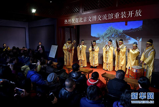 1月18日,游客在重新开放的北京文博交流馆欣赏智化寺京音乐。 新华社记者 罗晓光 摄