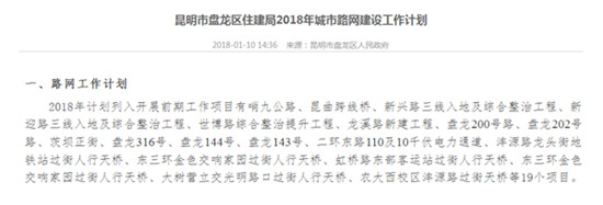 近日,昆明市盘龙区住建局公布了《昆明市盘龙区住建局2018年城市路网建设工作计划》该计划包括三线入地、道路综合整治提升工程、道路新建工程、110及10千伏电力通道建设、过街人行天桥建设等内容。计划的实施将涉及新兴路、龙溪路、东三环、沣源路世博路等共19个建设项目,加上计划于今年开展的东风路道路恢复提升工程,盘龙区将迎来较大规模的修路修桥工程;施工期间将对项目涉及区域交通造成一定程度影响,并给市民出行带来不便。
