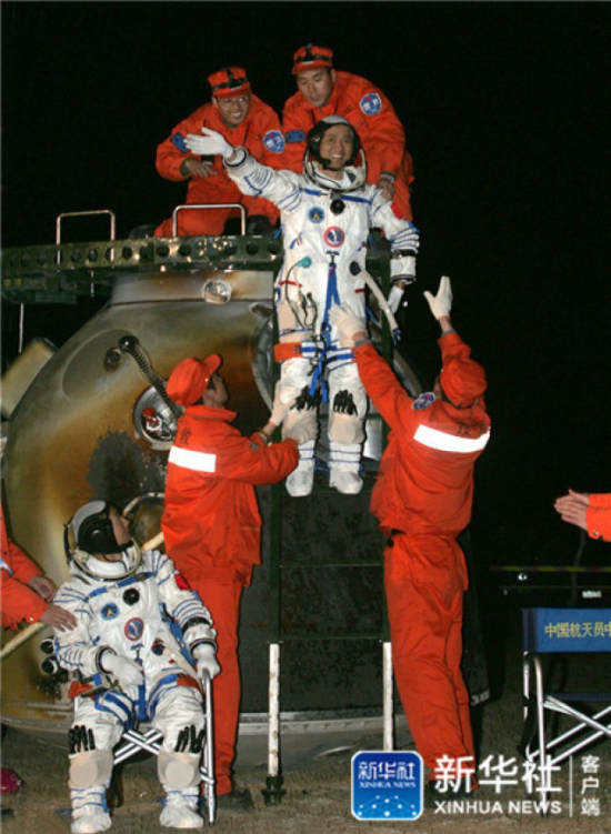2008年9月28日,神舟七号返回地球,航天员翟志刚、刘伯明、景海鹏(从左至右)自主出舱后向现场搜救人员挥手致意。新华社记者 王建民 摄