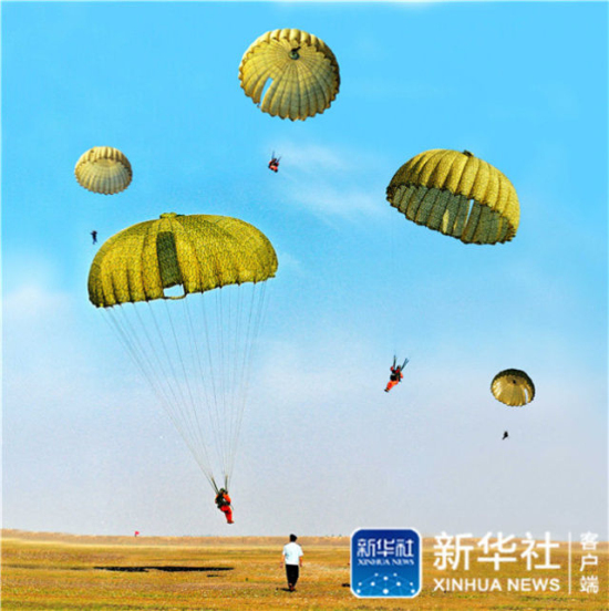 2001年6月,航天员在湖北进行跳伞训练。新华社发(朱九通 摄)