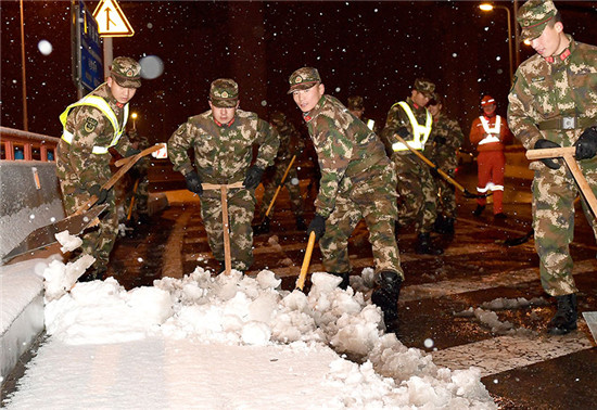 1月26日,武警上海总队机动支队士兵在上海市内环高架道路上清扫积雪。极端天气下,朋友圈里“冰封”雪景分外艳丽。诗意盎然的背后,是基层党员干群挺立起脊梁,负重前行。奋起于银装素裹的寒夜,冲锋在排难除险的风口。寒流面前,千万名基层党员干部群众筑起风吹不垮、雪压不塌的堡垒,开辟出温暖的通道。新华社记者 陈飞 摄