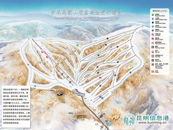 会泽大海草山国际滑雪度假区由会泽乌蒙山滑雪旅游开发有限公司开发建设,计划总投资7.5亿元人民币,分为两期建设。一期为滑雪场建设,二期建设主题酒店、冰雪度假小镇。一期滑雪场建设规模为50万平方米,包括初级雪道3条、中级雪道6条、高级雪道10条,以及单板公园、猫跳道、滑雪索道、滑雪场电梯,戏雪园区、雪地摩托车园区等。目前,该项目已建成戏雪区约2万平米,三条长度分别为180米、200米、240米的初级滑雪道,以及雪地摩托车道等。