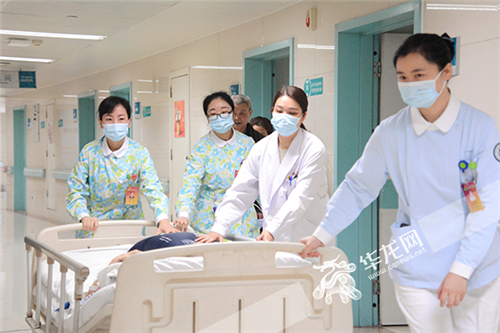 正在为患者转床的杨丽(左一)。 院方供图 华龙网发