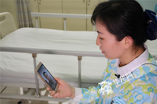杨丽与仍在岗位上值班坚守的丈夫视频连线。 院方供图 华龙网发