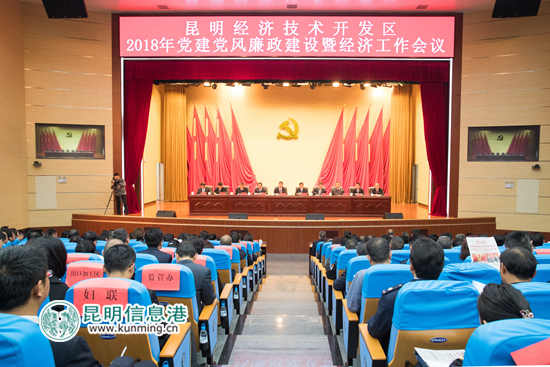 会上,昆明经开区党工委书记郭子贞作题为《学习贯彻党的十九大精神 融入新时代 奋力加快昆明经开区深度转型》的党建党风廉政建设工作报告。报告指出,2017年昆明经开区党工委深入学习宣传贯彻习近平新时代中国特色社会主义思想和党的十九大精神,充分发挥总揽全局、协调各方的领导作用,紧紧围绕年度目标任务,克难奋进、合力攻坚,务实苦干、创新实践。全区经济社会发展亮点突出,思想政治建设稳步推进,基层党组织建设取得突破,干部队伍和人才建设成效显著,党风廉政和反腐败工作扎实开展,在经济、政治、文化、社会、生态文明和党的建设方面都取得了明显进步。
