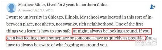 这位在“犯罪之都”芝加哥上过学的网民说道:“在(美国的)晚上,时刻要观察四周。如果你觉得不对劲,就马上离开(这个街区)。”