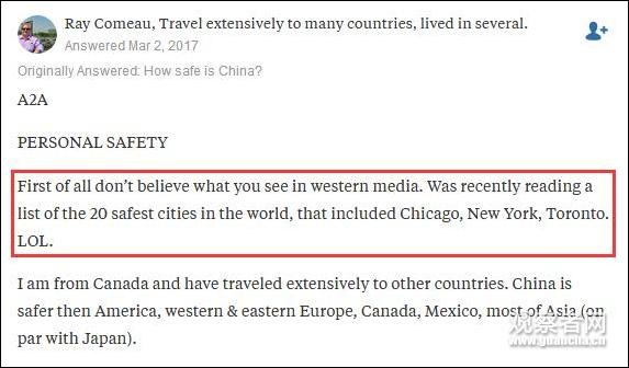 相反,一名现居扬州的答主表示,不论是在白天和晚上,他和她的老婆都能安心外出。而一名加拿大网民对西方媒体所宣传的“全球20大最安全城市”表示嗤之以鼻: