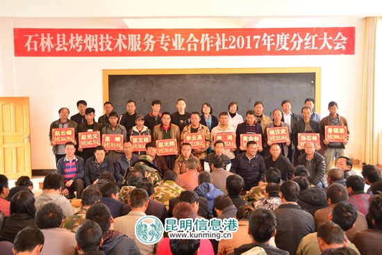 来自石林县西街口镇糯衣下寨的高峰,是石林云叶烤烟技术服务专业合作社的社员。今年,高峰家分得的红利是311.9元。高峰说:“现在国家对农村的政策越来越好了,烤烟移栽大田的整地理墒都有补贴,去年,我家四口人,烤烟收入就有10多万了!”到现场参加分红大会的许多社员代表都表示:“烤烟技术服务专业合作社的发展,需要我们全体社员心往一处想,劲往一处使,我们社员才能享受更多的福利。”
