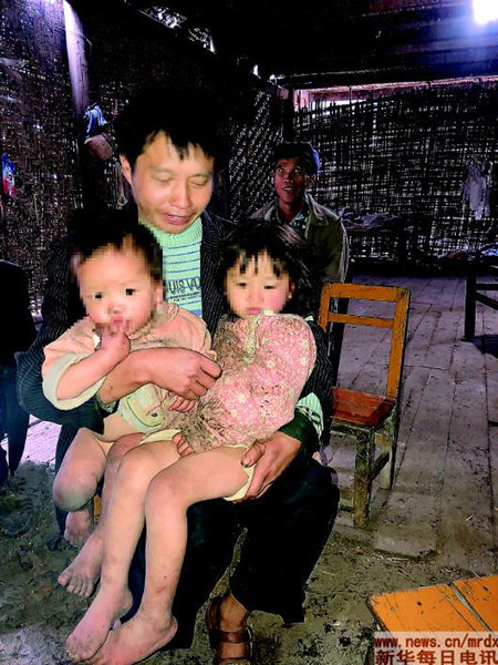 他看起来并不悲观,他将2岁的儿子和6岁的女儿抱在怀中,孩子光着的腿已冻得通红。冬日寒风凛冽,我们担心孩子会冻着,他却摆着手说:不冷、不冷。