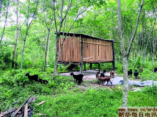 王成安在扶贫干部黄海军的帮扶下,精准选择养殖市场稳定的本地黑山羊,他在橡胶林建起了一座高脚羊舍,已卖了一批羊。刘邓 摄