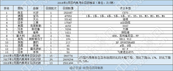 根据国家质检总局缺陷产品管理中心3月份发布的召回公告,经济日报-中国经济网汽车频道经过汇总、统计,整理出“2018年3月国内乘用车召回榜单”。3月,国内乘用车市场共有13个品牌发布15次召回公告,累计召回汽车360774辆,召回数量同环比均出现大幅下降,其中同比下降86.17%,环比下降85.58%。
