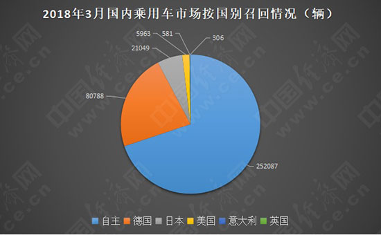 分国别来看,3月发布召回公告的13个品牌中:自主共1个品牌召回汽车252087辆,占总召回量69.87%,召回数量最大;其次,德系3个品牌累计召回汽车80788辆,占比22.39%;接下来,日系共4个品牌累计召回汽车21049辆,占比5.83%;之后,美系2品牌召回汽车5963辆,占比1.65%;意大利和英系各自召回汽车581辆和306辆,分别占比0.16%和0.08%。