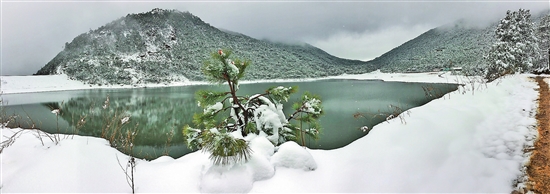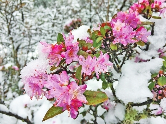 4月6日夜,丽江玉龙雪山降下大雪,昨日凌晨积雪已将玉龙雪山染白。在丽江市白沙镇文海村周边的山上,积雪最深达30厘米。在丽江高山植物园,积雪覆盖在盛开的杜鹃花上,景色格外迷人。(记者 孙晓云 摄)