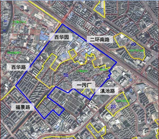 在列入城中村改造计划4年后,2012年底的昆明市土地推介会上,船房村城改项目曾以“西山区38号地块城镇化建设项目 ”的名义公开推介,改造地块的四至范围界定为:东至青少年活动中心,南至污水处理厂,西至西华园公园,北至二环南路。项目总征地面积为1226.18亩,其中船房新村、老村两个城中村改造面积为929.38亩,西华公园改扩建面积为296.8亩,总拆迁量则达到181万方之巨。