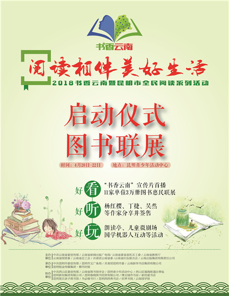 “2018书香云南”暨昆明市全民阅读系列活动启动仪式由中共云南省委宣传部、云南省新闻出版广电局、云南省委省直机关工委、云南省教育厅、云南省国资委、云南省总工会、共青团云南省委、云南省妇女联合会、云南出版集团有限责任公司主办,昆明市委宣传部、昆明市文广体局、共青团昆明市委、云南新华书店集团有限公司、昆明报业传媒集团·都市时报承办,主题为“阅读·相伴美好生活”。