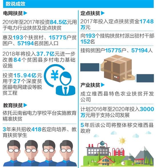 中国南方电网有限责任公司云南公司作为处于公共服务行业、从事电力基础保障工作的驻滇央企,多年来不折不扣贯彻落实党中央、国务院和云南省委、省政府关于脱贫攻坚的各项决策部署,秉承“精准、质量、长效”理念,全力以赴参与云南省脱贫开发工作,积极探索扶贫路径。在做好电力供应的同时,通过电网扶贫、定点扶贫、产业扶贫、教育扶贫等,积极打造“两网四机制”的扶贫工作格局,即稳定的电力保障网、特色农产品销售网以及组织保障机制、教育培养机制、资金支持机制、典型选树机制,有力地支持了贫困地区发展,为云南省打赢脱贫攻坚战提供了坚强支撑。