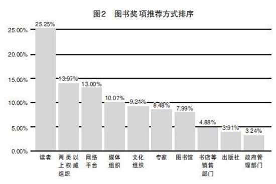 对图书奖项推荐评选方式的认同度。在图书推荐评选方式中,设置了10个选项,即读者、网络平台、媒体组织、文化组织、专家、图书馆、书店、出版社、政府管理部门、两类以上权威组织。在诸多方式中,读者推荐评选占比25.25%,位列第一;两类以上权威组织推荐评选占比13.97%,网络平台推荐评选占比13.00%,分列第二三位。(详见图2)