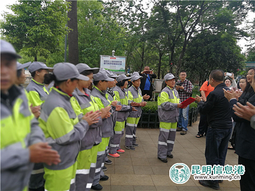 为了表彰秦达菊的见义勇为,4月27日下午,五华区环卫处相关领导、北控城市服务昆明五华北控环境产业发展有限公司负责人来到翠湖边,为秦达菊举行了一个简短的表彰仪式,为秦达菊颁发了奖状和奖金,并为翠湖片区所有环卫工人送上了节日的问候。劳动的人最美、最善良,五一国际劳动节来临之际,为广大劳动者送上问候的同时,让我们一起尊重他们的劳动成果,爱护环境,他们是你我身边“最美的人”。