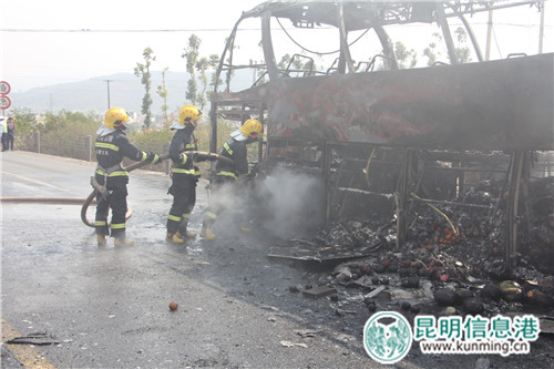 15时33分,消防官兵到达事故现场后发现,一辆客车停在公路上,车辆正在熊熊燃烧,车身已经被烧得面目全非。经询问车主得知,车上无被困人员,但此路段等候的车辆已经排起了长长的队伍。且现场火势越来越大,再不及时扑灭大火,可能造成汽车油箱爆炸事故的发生。