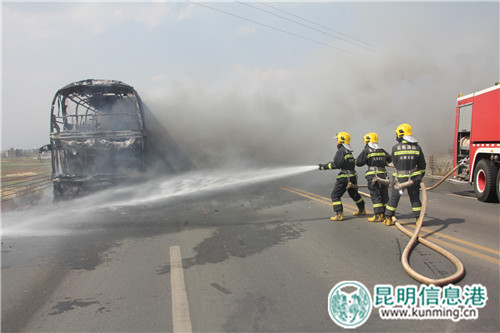 6686体育讯 记者劳学丽 4月27日15时26分,大理弥渡县祥临公路大庄营路口处有一辆客车行驶途中发生自燃。15时27分,弥渡公安消防大队接到群众报警后,立即出动2车10名官兵前往现场进行处置。