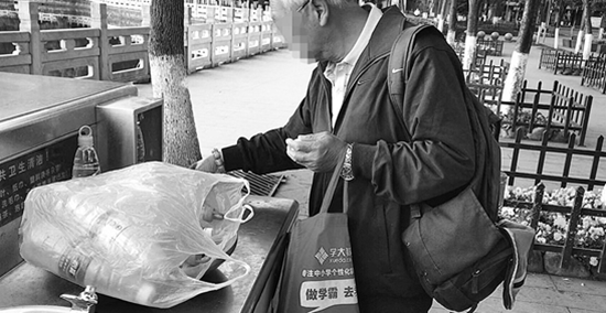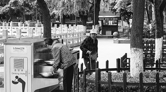 从王先生提供的照片上记者看到,在翠湖九曲桥附近的一台直饮水机旁,一位头发花白的大爷正在接取饮用水。他手里提着两个袋子,身后背着一个双肩包,放在直饮水机台上的塑料袋里装着五六个空的矿泉水瓶,看样子这位大爷这一趟不接个八九瓶水都不行。