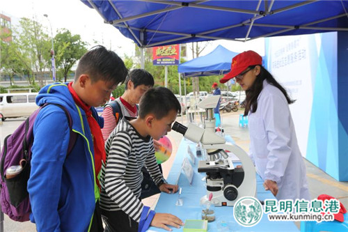 活动现场,青年志愿者们在展台上展示出了微缩版的污水处理工艺和装置,活性污泥微生物镜检装置吸引了过往市民和一些学生都来好奇地观看。现场还分发了环保宣传册、以及环保袋、笔等小礼品。面对民众的好奇提问,志愿者们以讲解、互动的方式一边答疑,一边进行环保宣传教育,以此宣传和动员更多社会力量关心滇池治理、增强环保意识、参与环保工作。