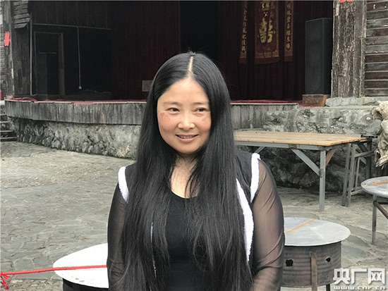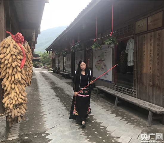 沈艳燕穿着羌服向记者展示羌寨文化特色