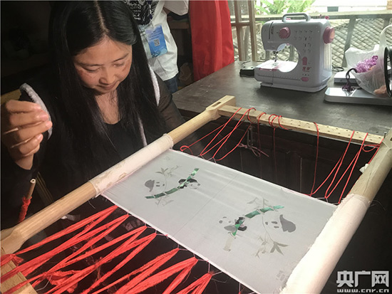沈艳燕向记者展示羌绣——绣大熊猫