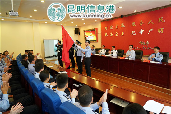 在庄重的音乐声中,离团青年代表在四名护旗手的护卫下,手持团旗踏着有力的步伐迈入会场,郑重的把手中团旗交接到新团干部手中,代表了昆明公安共青团工作的新老传承和接续发扬。简单的交接仪式,在铿锵有力的步伐动作,干净利落的举旗敬礼,饱含深情的离团感言中进行,整个离团仪式充满了庄严感和。