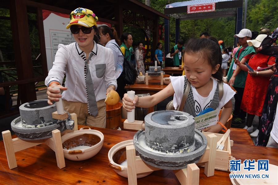 5月13日,在江西萍乡市湘东区白竺乡大丰村,萍乡市安源区城北小学二年级学生廖伊琳(前右)体验豆腐制作。
