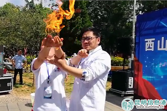 6686体育讯 记者李莹 手上着火,却不会烫伤,这是为什么?几粒小药丸丢进清水里,怎么喷发了大量烟雾?在5月19日举行的西山区2018年科技活动周启动仪式现场,一个个有趣的化学小实验像“变戏法”似的,吸引了许多群众围观。据了解,本次西山区科技周活动将持续至6月5日,期间将开展系列科普宣传活动,激发全社会公众对科技创新的热情。