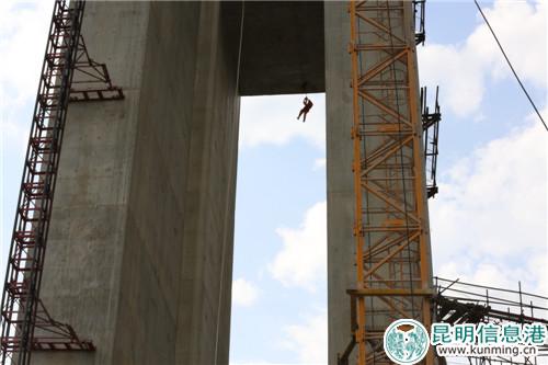 12时,消防官兵到达施工现场,经现场侦查了解,有2个蜂窝情况特殊,处理难度较大,一个是在2号桥墩的钢架上,需要携带装备徒手攀爬至52米的高的钢架上进行处置。另一个是在58米高的3号桥墩隔板上,需要设置支点,现场悬垂处置。