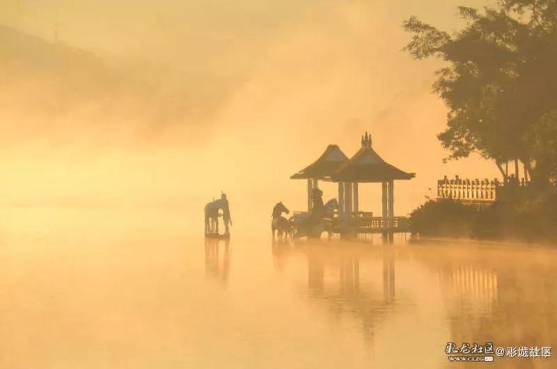 ♡朦胧雾气中的洗马湖,湖面划过的小舟和湖中的莲叶,恍惚间像是走进了水墨画中。