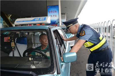 6686体育讯(昆明日报 记者王姗 摄影记者杜文蕾)5月23日,昆明市出租汽车管理局联合机场公安局、机场交通运输部等多部门对机场及周围的营运车辆开展集中整治行动,执法人员当场对非法运营车辆进行检查和处置。