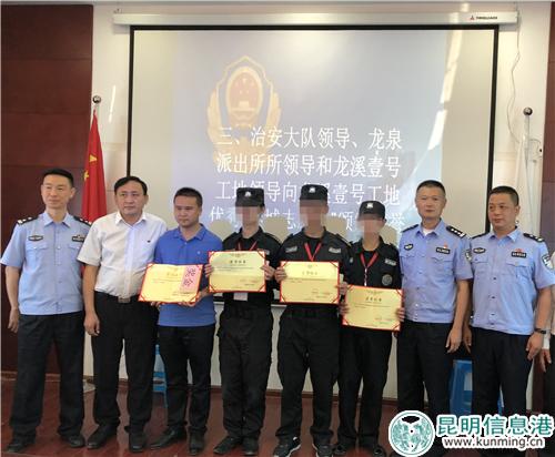 会上,民警通报了龙溪壹号工地“春城治安志愿者”举报、协助抓获盗窃工地建筑材料的案件情况,并对四名“春城治安志愿者”颁发荣誉证书及奖金。