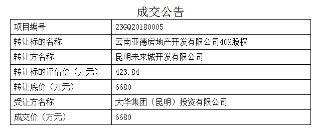此次股权转让前,云南亚德房地产由云南城投集团下属的昆明未来城开发有限公司和云南益新畅鸿房地产开发有限公司共同持股,持股比例为80%和20%。此次转让的是未来城公司持有的40%股权。
