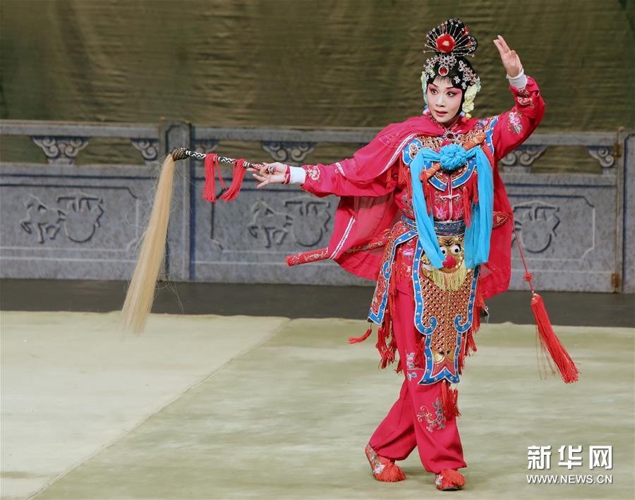 5月28日,青年演员白金(剧中饰演红线)在香港大会堂表演梅派经典剧目《红线盗盒》。