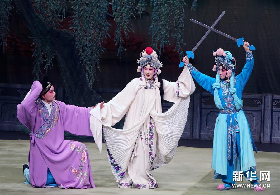 5月28日,青年演员马佳(中,剧中饰演白娘子)、李春(左,剧中饰演许仙)、蒋兰兰(右,剧中饰演小青)在香港大会堂表演梅派经典剧目《白蛇传—断桥》。