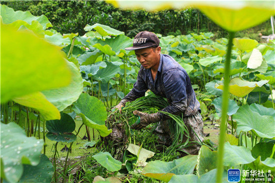 ↑6月4日,在湖南省湘西土家族苗族自治州龙山县泗坪村,一名农民在莲藕田间除草。曾祥辉/摄