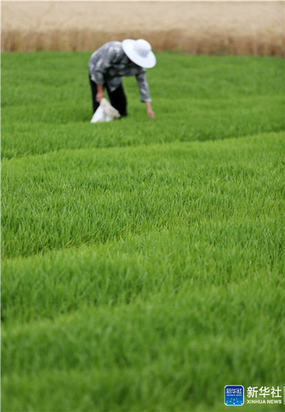 ↑6月4日,山东省临沂市郯城县榆林三村农民在水稻育秧田里清除杂草。 张春雷/摄