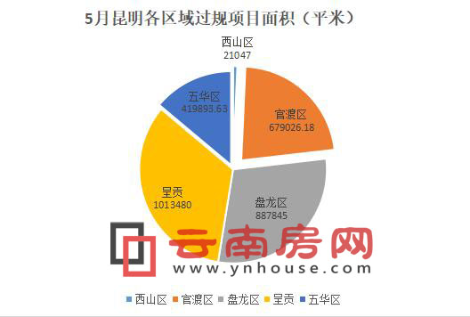 从区域比较,呈贡5月过规面积仍然抢眼,过规总建面101万方,有中铁大厦、浩创酌悦、兴冶广场3项目过规。其次,五华区有芳华、龙韵春域过规,总建筑面积为41.99万平米。盘龙区有春之眼、中建龙熙壹号等3项目过规,总建面88.78万方。官渡区有中南·云境、昆明凯晟商业中心、华润悦府、万科翡翠滨江等5项目过规,总建面67.9026万平米。西山区仅有1项目过规,总建面2.1047万平米。