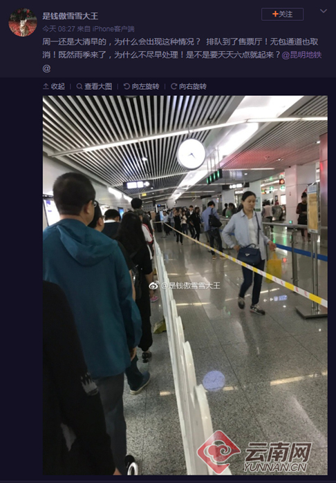 “不要怀疑,这确实是在排队等候通过地铁安检,你看到地铁站了没?”6月11日早高峰时段,昆明多名网友发帖吐槽称,“地铁站外等候安检的人流已经排到了大街上,上班可能要迟到了。”当日下午,昆明轨道交通集团有限公司回应称,为缓解高峰期排队过长的问题,昆明地铁运营有限公司已及时恢复13个车站的无包通道。
